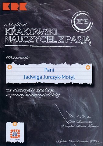 Pani Jadwiga Jurczyk Motyl – nauczyciel, bibliotekarz – za swoją pracę, wszechstronne działania i zaangażowanie została uhonorowana tytułem NAUCZYCIELA Z PASJĄ. To niezwykłe wyróżnienie przyznawane przez Pana Jacka Majchrowskiego Prezydenta Miasta Krakowa jest powodem do dumy dla każdego nauczyciela i satysfakcji, że dobra praca zostaje dostrzeżona